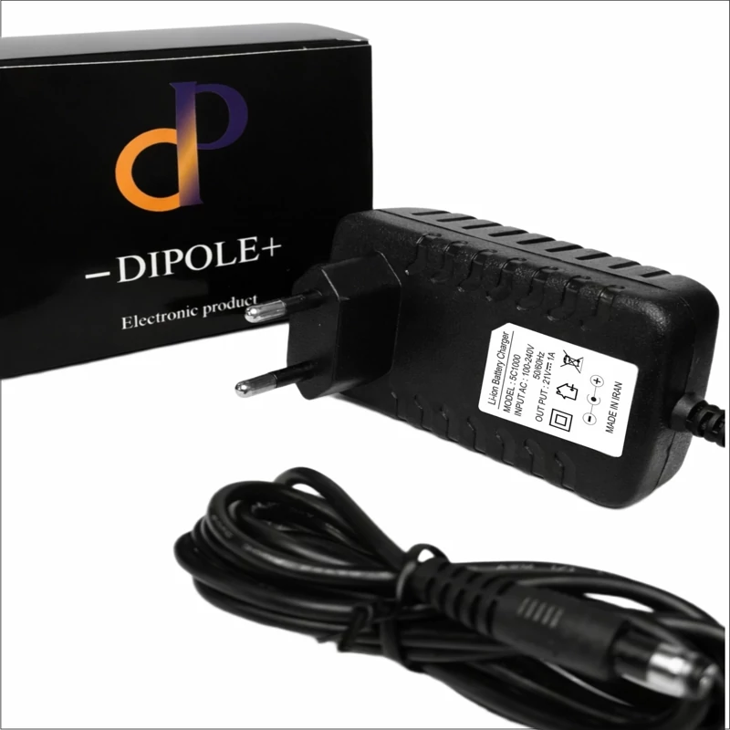 این شارژر مناسب برای شارژ انواع باتریهای لیتیوم یونی Li-ion و لیتیوم پلیمیری Li-po پنج سل است. شارژر پنج سل لیتیومی فوق دارای یک نشانگر LED است که در زمان شارژ به رنگ قرمز و با تکمیل شارژ و به اصطلاح فول شارژ شدن به رنگ سبز در می آید. همچنین شارژر 21 ولت یک آمپر DIPOLE دارای مدار محافظ داخلی است که از شارژر در برابر جریان اتصال کوتاه و شارژ بیش از حد باتری محافظت میکند.